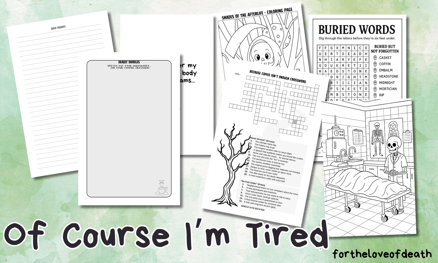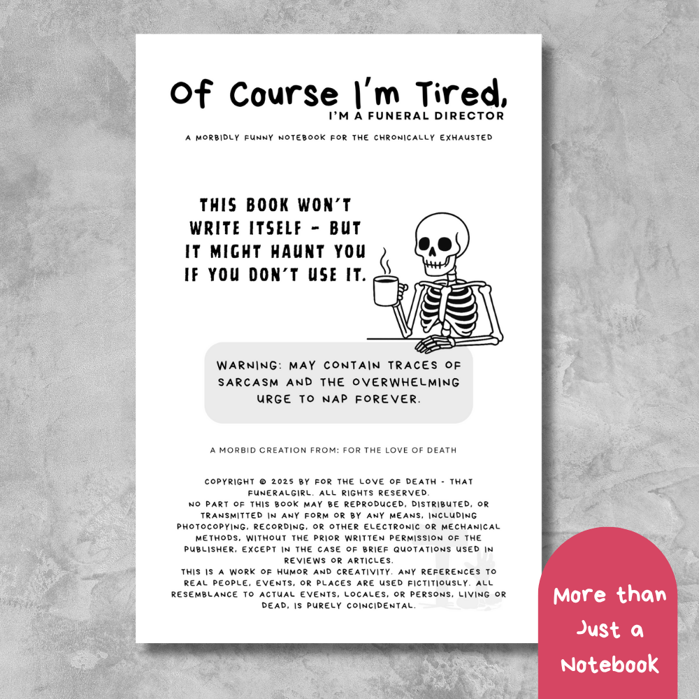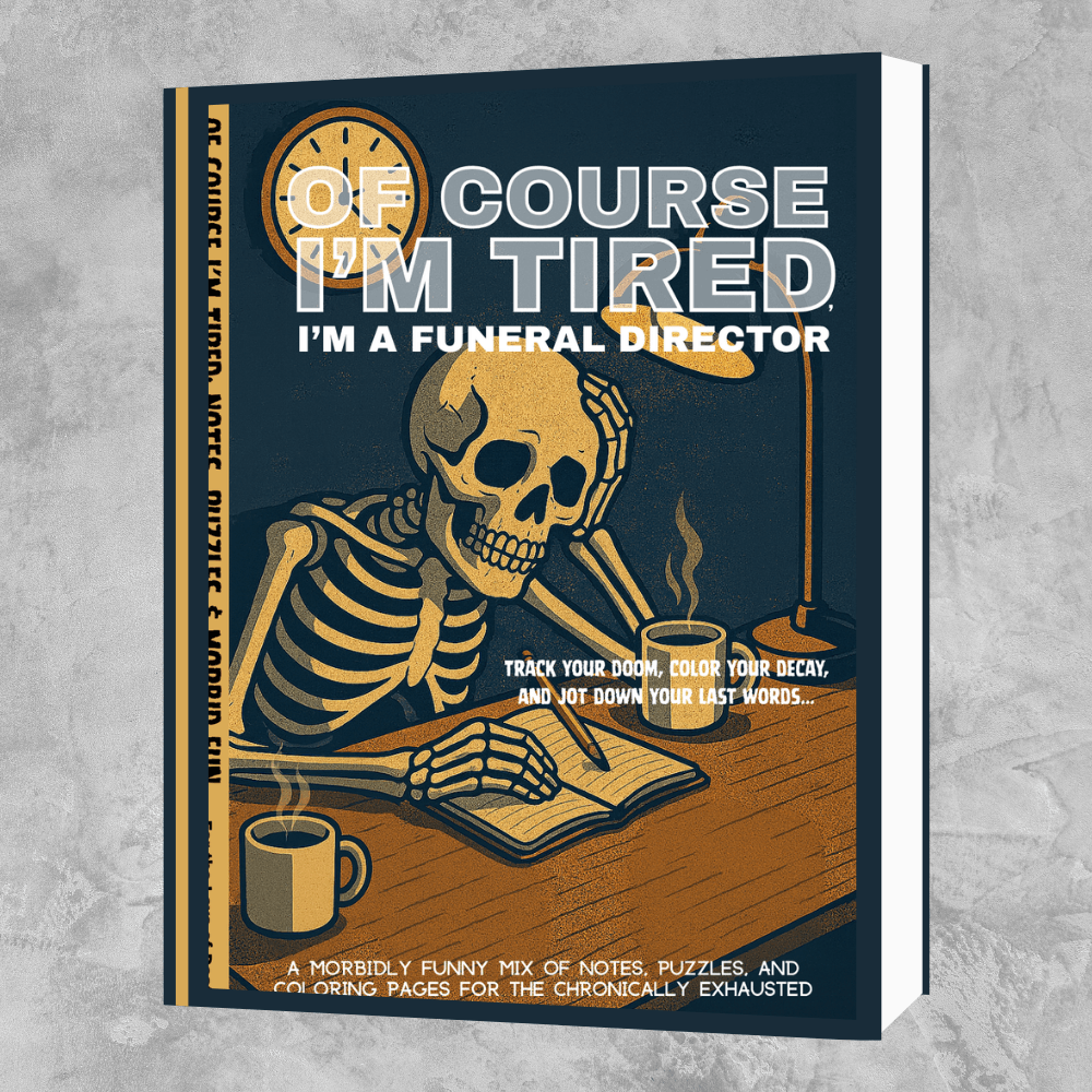 This isn’t just another boring blank notebook. Of Course I’m Tired, I’m a Funeral Director is a morbidly funny journal and activity book created for the people who keep the death care world running.