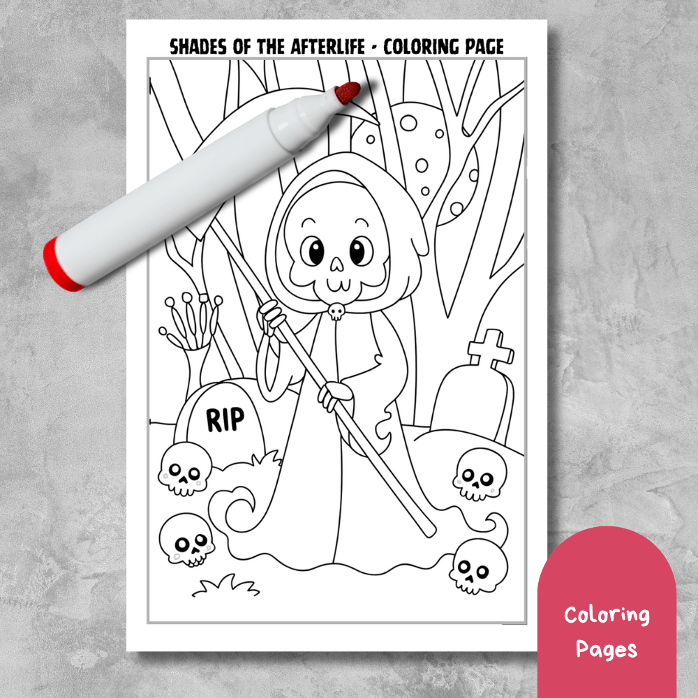 Coloring Pages – creepy but cartoon-cute funeral scenes to de-stress between services.